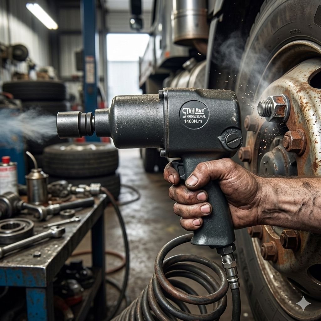 Мощен и надежден пневматичен ударен гайковерт, създаден за интензивна работа в автосервизи, вулканизатори и професионални работилници. Благодарение на двойния ударен механизъм инструментът осигурява висок въртящ момент до 1400 Nm, позволяващ бързо развиване дори на силно затегнати болтове.