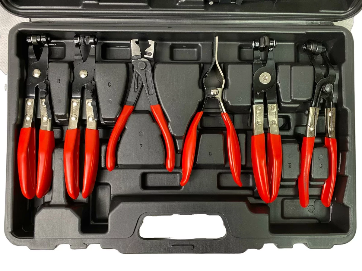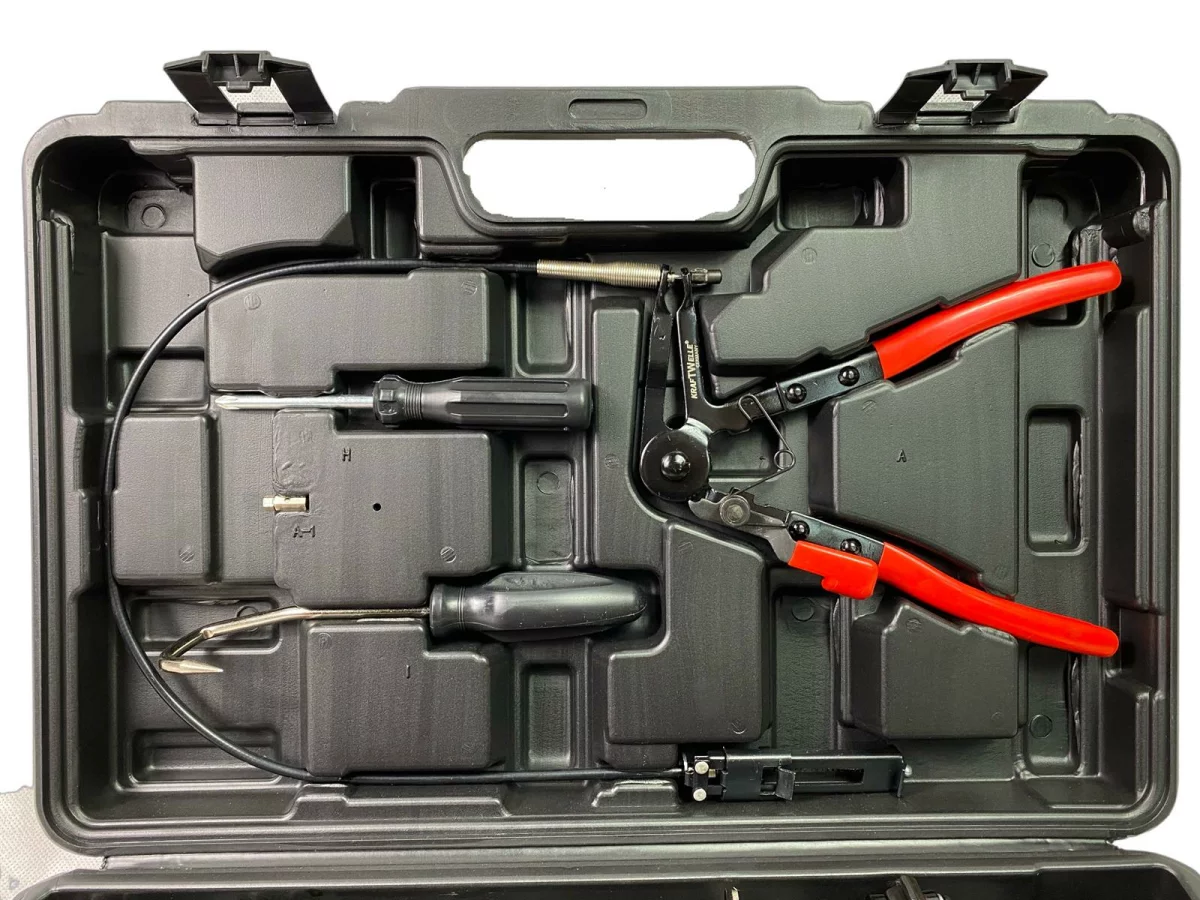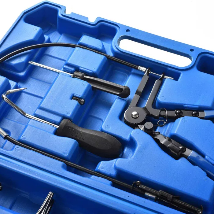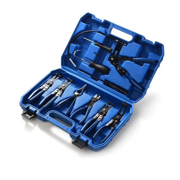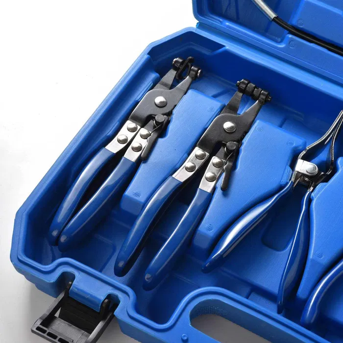 - Практичен комплект клещи за маркучи, състоящ се от 9 части в здрав твърд куфар.