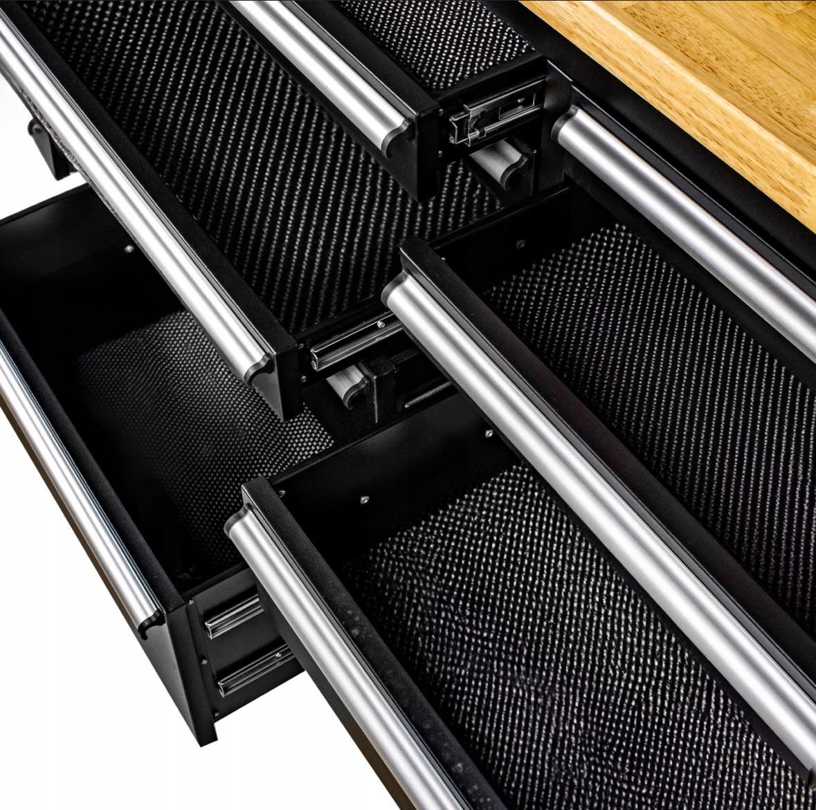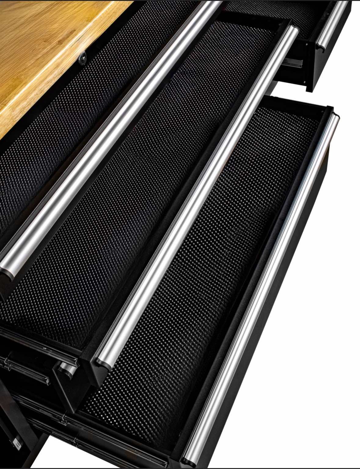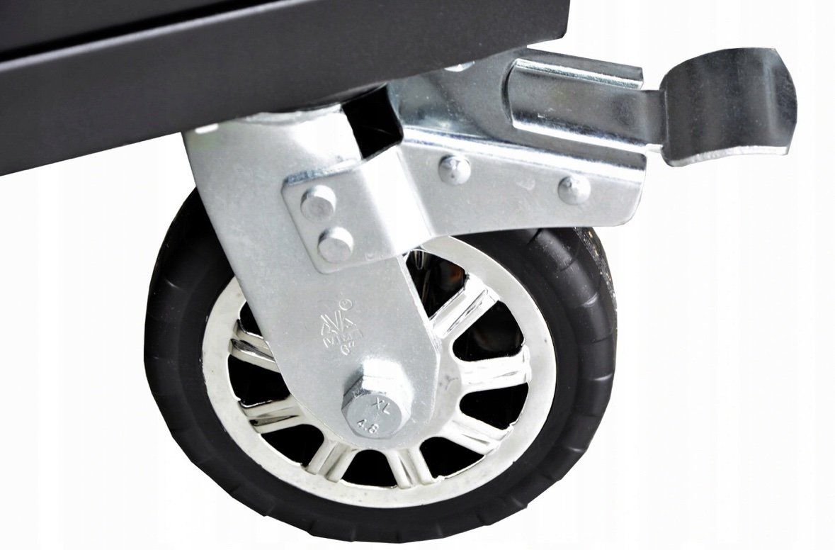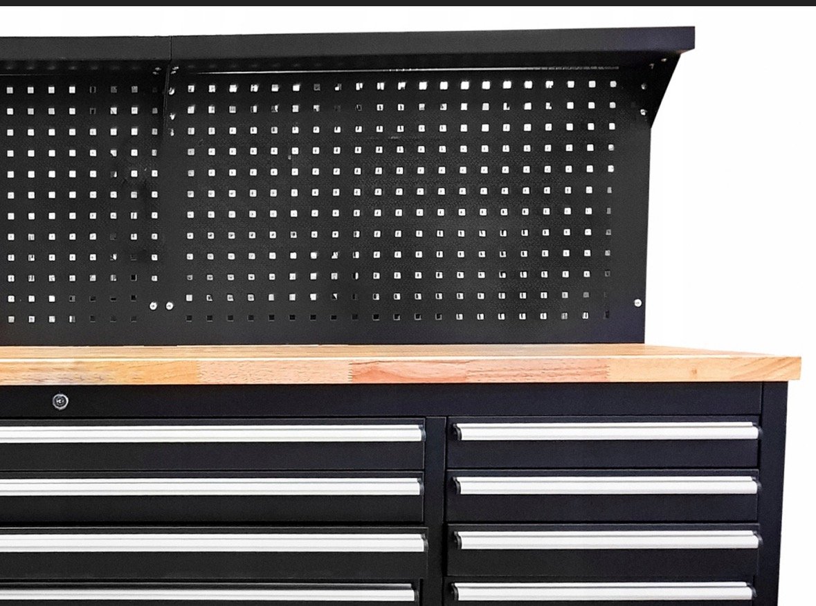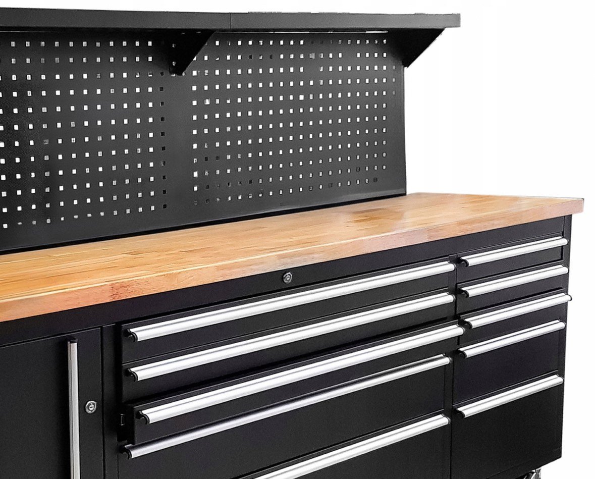 Количката разполага с шкаф и 10 чекмеджета (празни) , различни по размер. Има и удобен работен плот и място за закачкали за инструменти.