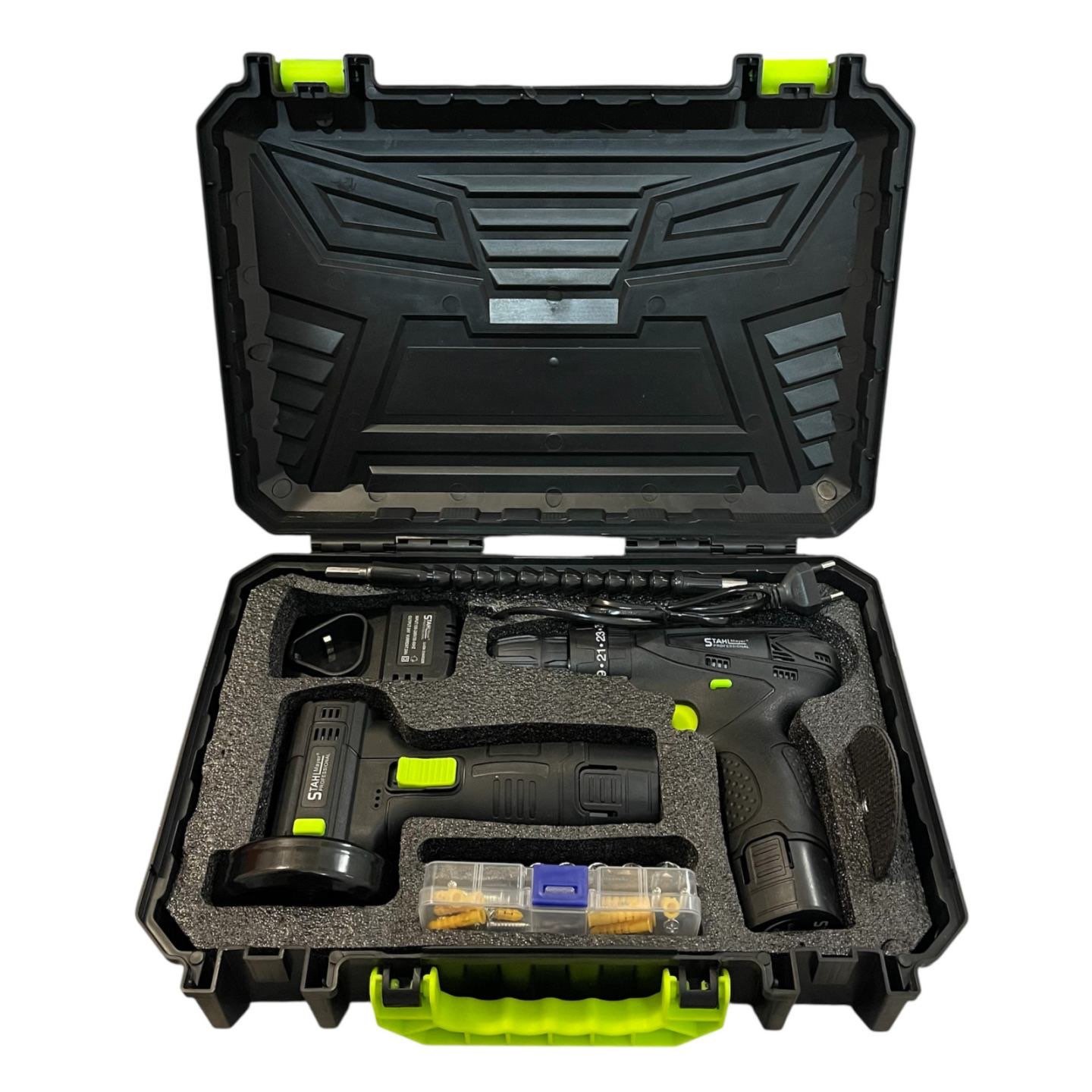 Професионален комплект STAHLMAYER 24V, включващ акумулаторен ударен винтоверт и мини безчетков ъглошлайф, събран в удобен куфар с две батерии и зарядно. Идеално решение за ремонт, монтаж, строителство и сервизни дейности – у дома или на терен.