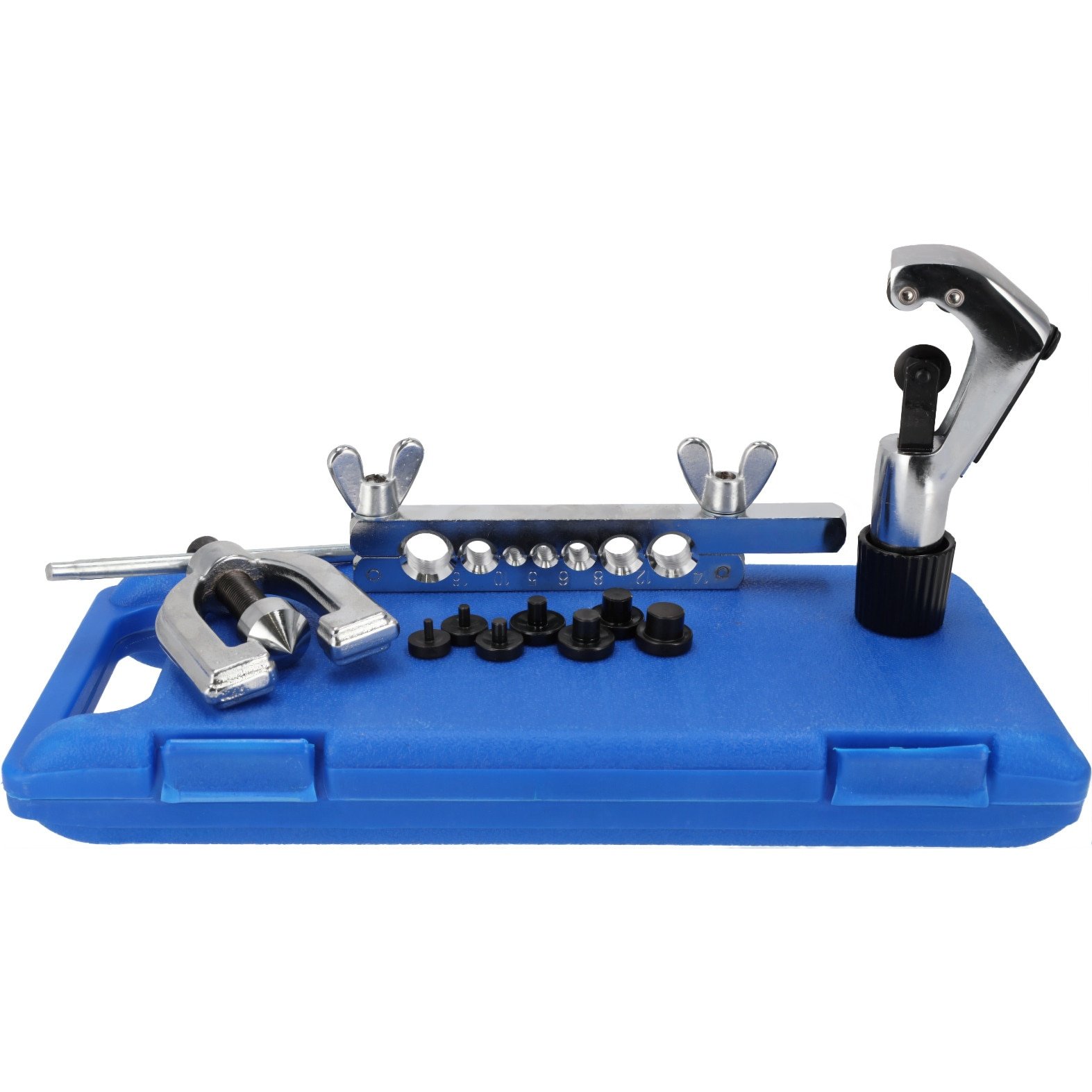 Конусната дъска осигурява прецизно и равномерно разширяване под ъгъл 45°, което гарантира надеждно и плътно съединение на тръбите. Комплектът включва различни адаптери, съвместими с най-често използваните размери тръби, както и резачка за чисто и точно отрязване.