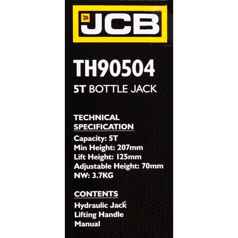 Хидравличен крик JCB TH90504 е предназначен за товари с тегло до  5т. Максималният ход на буталото е 125 мм, а на винта 70 мм. Предназначен е за вертикални подемни операции. Максималната му височина е 402 мм, а минималната 207 мм.