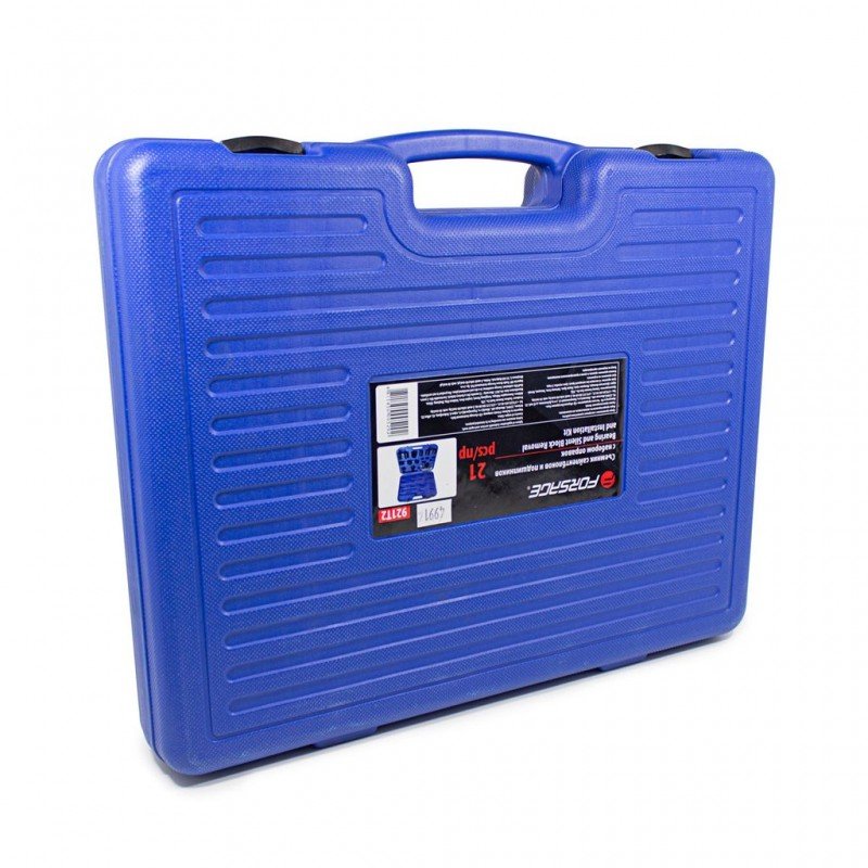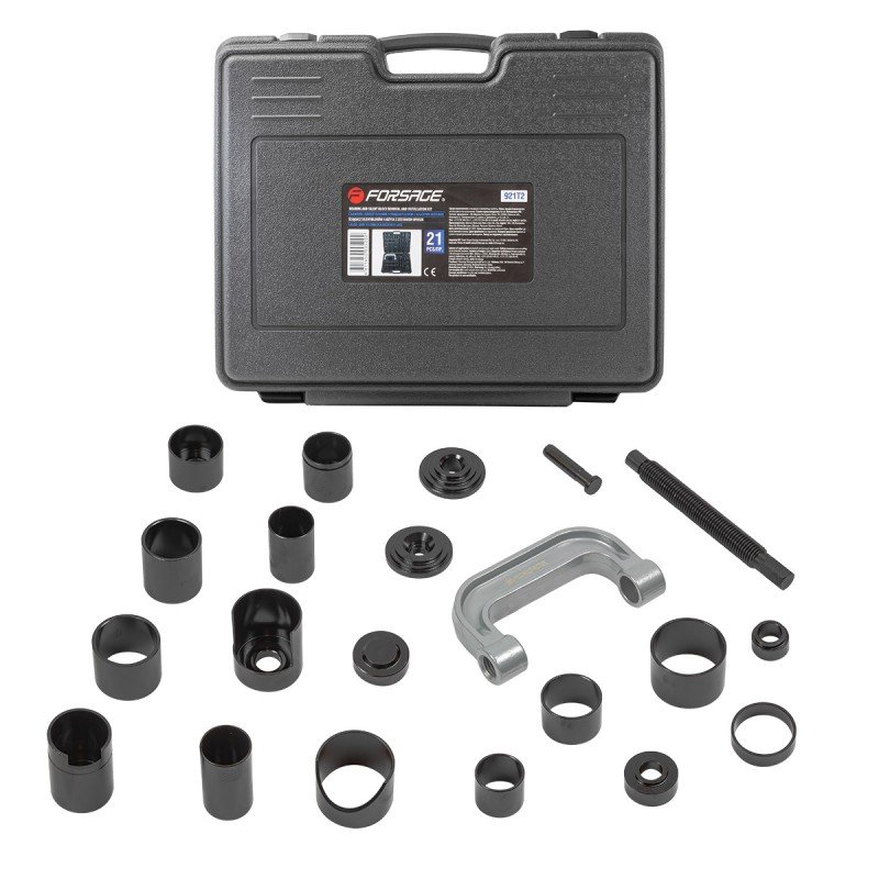 Универсална скоба за лагери, шарнири и тампони 21 части. Комплектът съдържа най-често използваните размери за леки и товарни автомобили. Служи за бързото отстраняване и монтиране на различни детайли. Основно се ползва за шарнирни болтове, тампони и някои модели лагери.