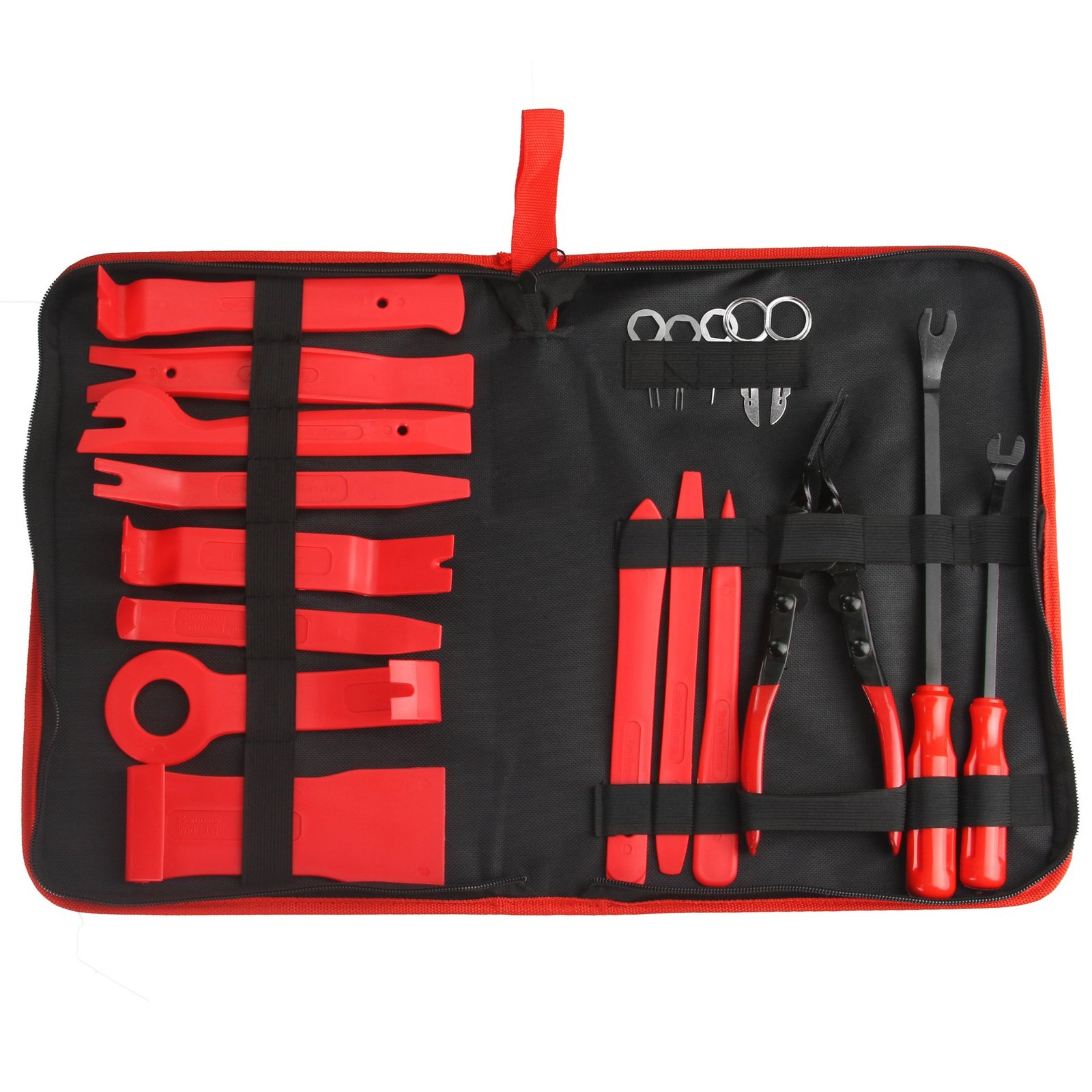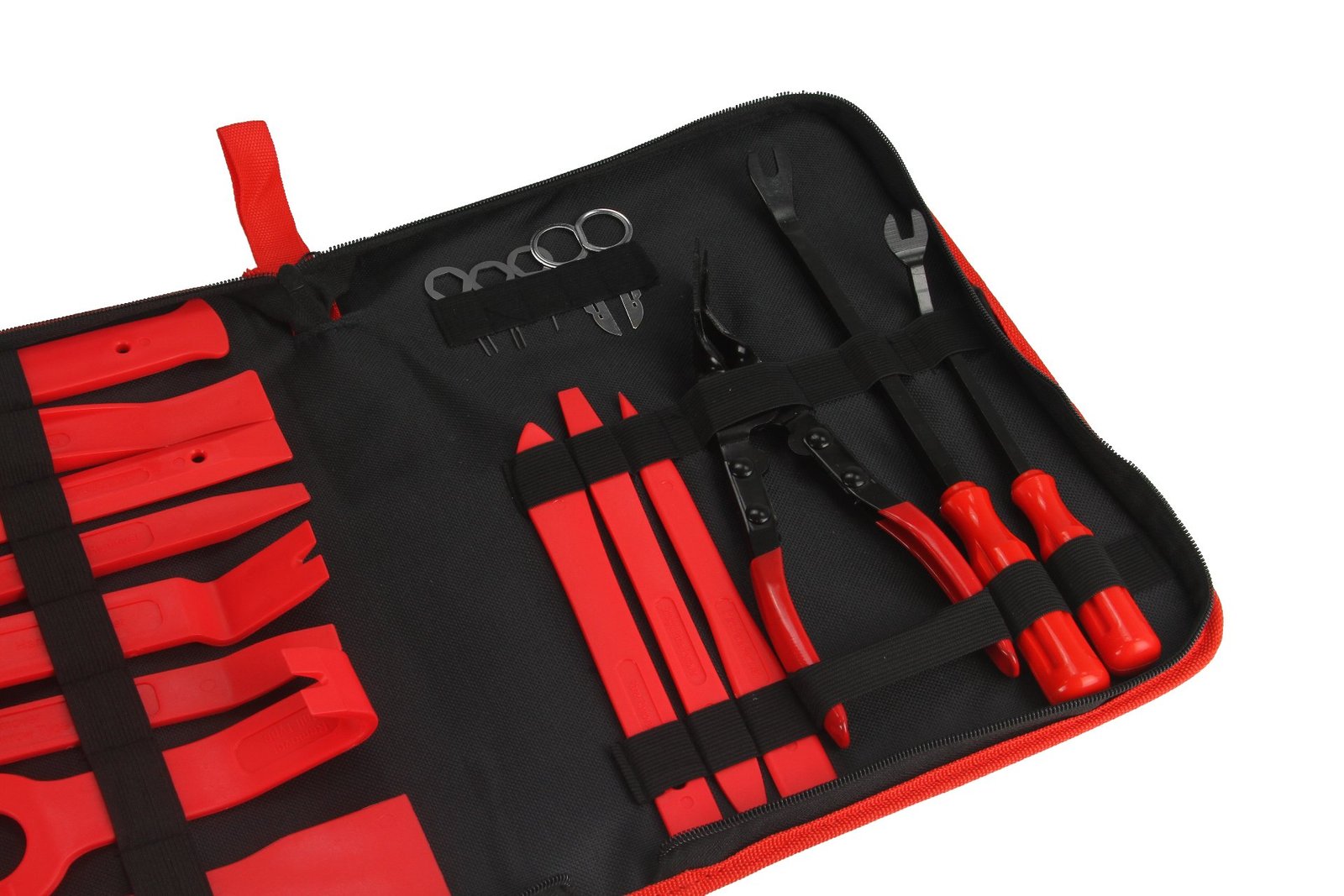 Комплект от 19 инструмента за демонтаж без повреди на декоративни части, пластмасови щипки, капаци, стъкла за огледало за обратно виждане и др. Идеален за използване на труднодостъпни места и върху боядисани повърхности. Широка гама от приложения благодарение на голям брой различни инструменти за демонтиране.
