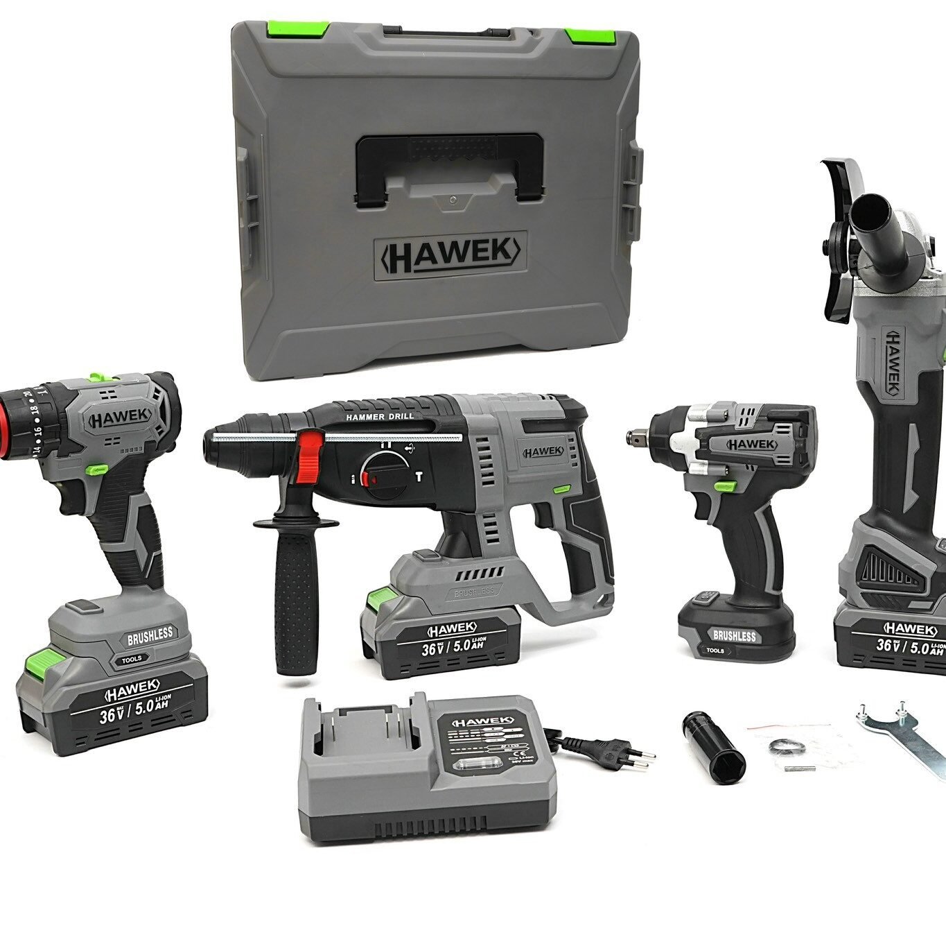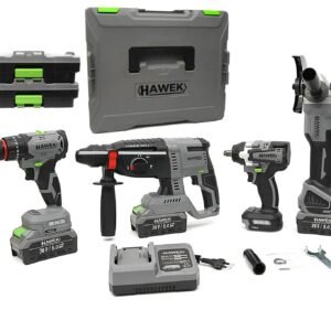 КОМПЛЕКТ ОТ АКУМУЛАТОРЕН ПЕРФОРАТОР, ЪГЛОШЛАЙФ 125 ММ, ГАЙКОВЕРТ И ВИНТОВЕРТ 36V С 3 БРОЯ БАТЕРИИ 5AH В КУФАР И ЗАРЯДНО HAWEK