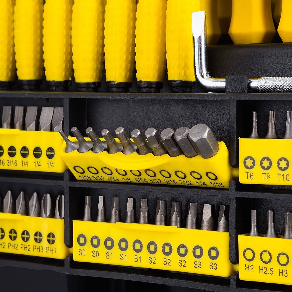 • 60 бр битове: 2 х SL3;2 х SL4;3 х SL5;3 х SL6;2 х SL7;2 х PH0;3 х PH1;3 х PH2;2 х PH3;2 х PZ0;3 х PZ1;3 х PZ2;2 х PZ3;1 х H1.5;1 х H2;1 х H2.5;1 х H3;2 х H4;1 х H5;1 х H5.5;2 х H6;2 х T8;2 х T9;2 х T10;2 х T15;2 х T20;2 х T25;2 х T27;2 х T30;2 х T40
