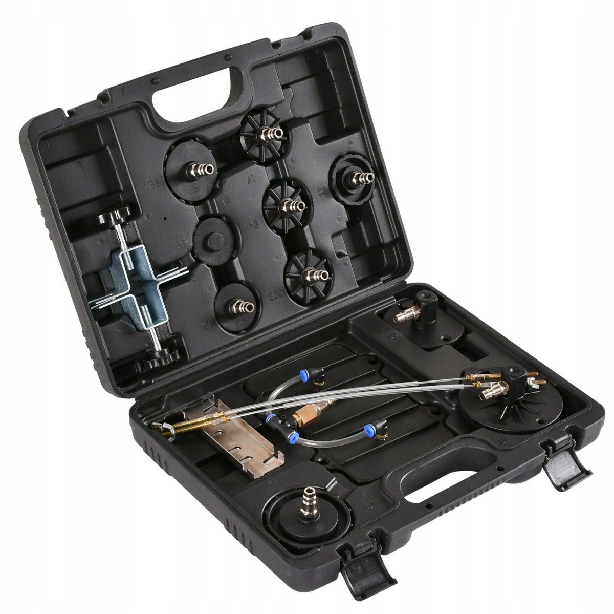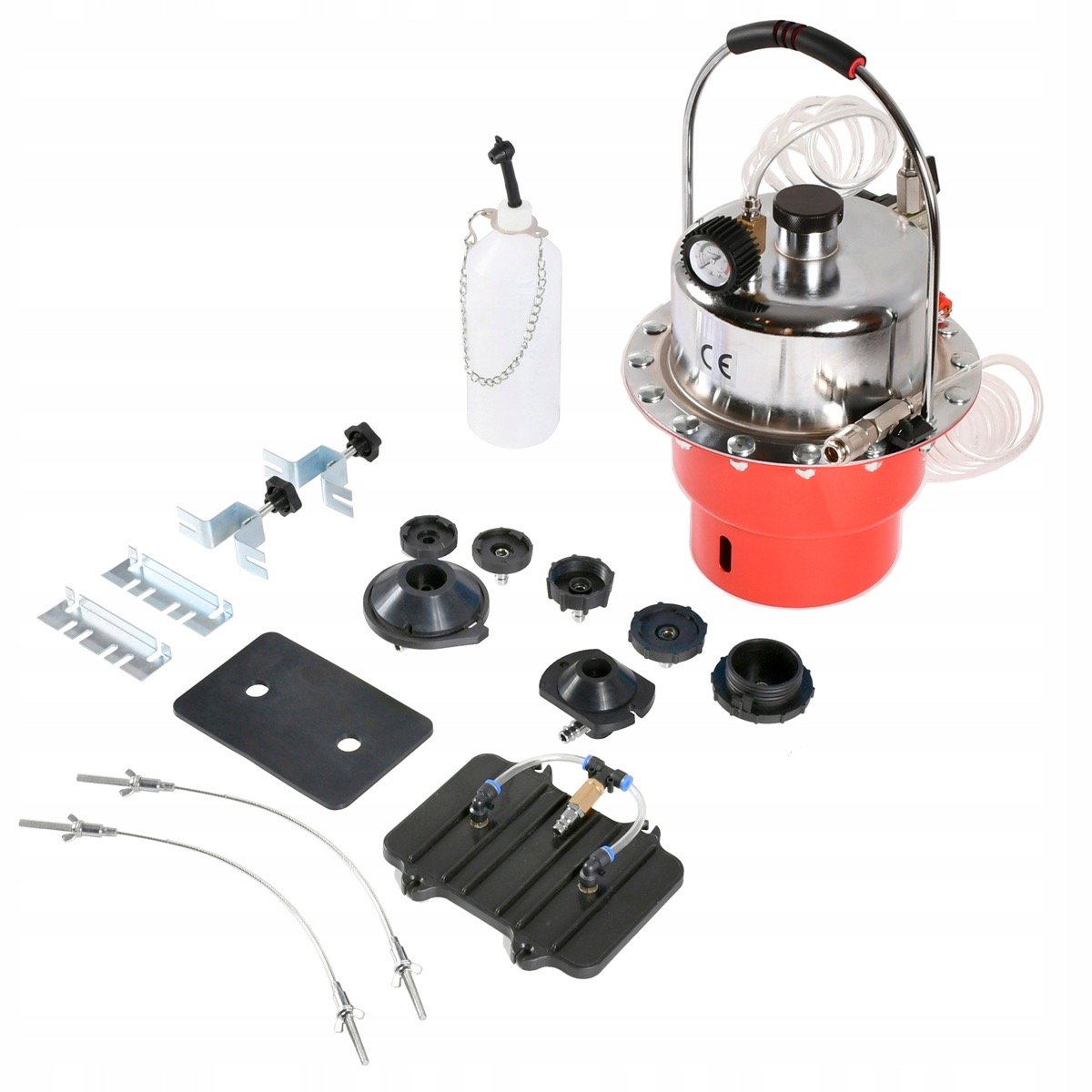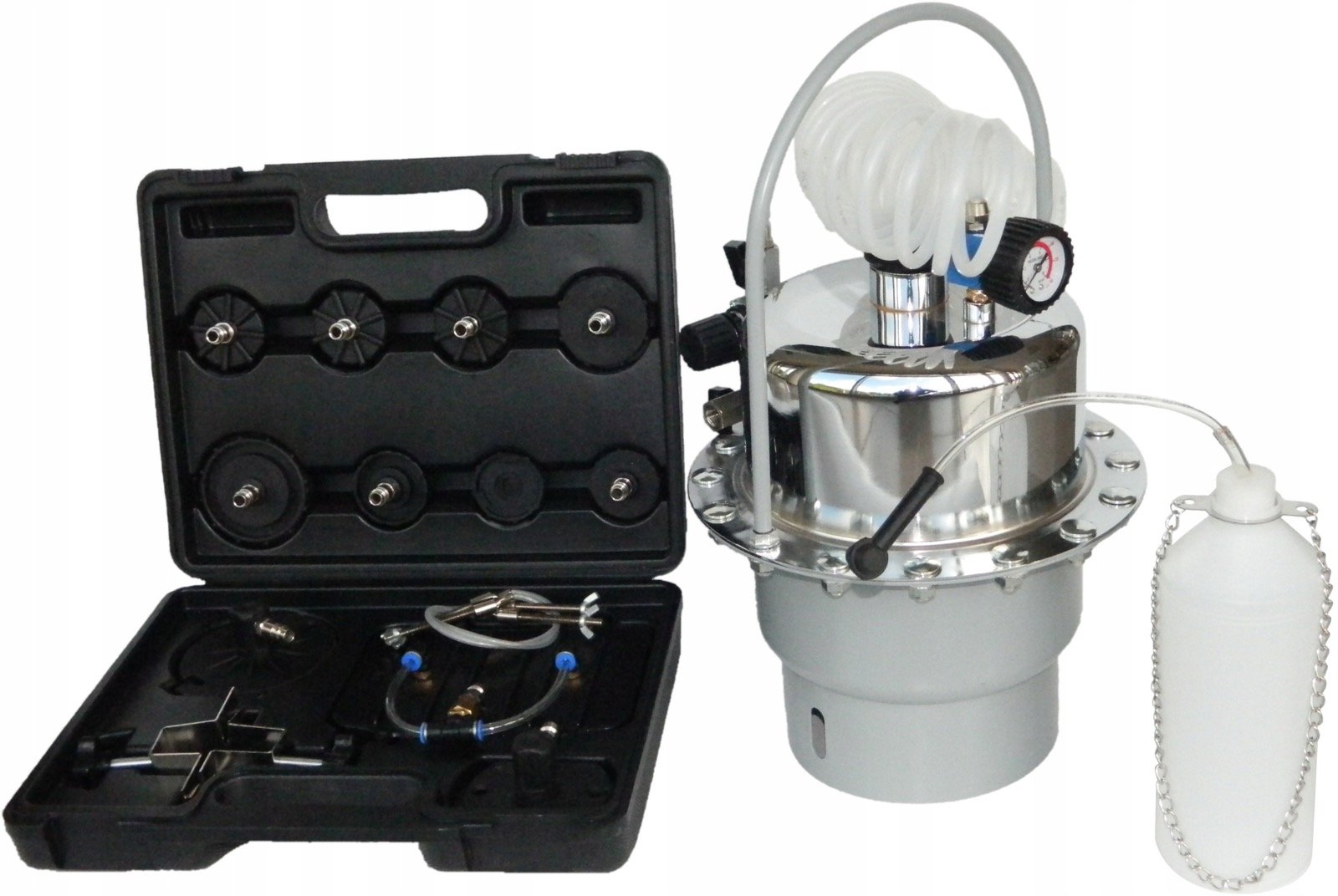 Сервизен комплект за спирачна система. Устройството позволява един човек лесно и бързо да смени течността в спирачната система и хидравличния съединител. Комплектът също ви позволява бързо обезвъздушаване на спирачната система. Комплектът включва удобен куфар с комплект адаптери, които позволяват работата на повечето спирачни системи.