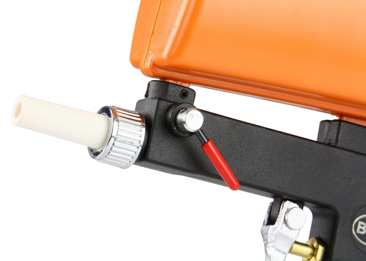 БЛАГОДАРЕНИЕ НА ИЗПОЛЗВАНЕТО НА РЕЗЕРВОАРА В ГОРНАТА ЧАСТ НА ПИСТОЛЕТА, ПЯСЪКЪТ САМ СЕ ПЪЛЗВА НАДОЛУ КЪМ ПИСТОЛЕТА, КОЕТО ОСВЕН ТОВА ГАРАНТИРА ПО-МАЛКО ИЗИСКВАНЕ НА ВЪЗДУХ.