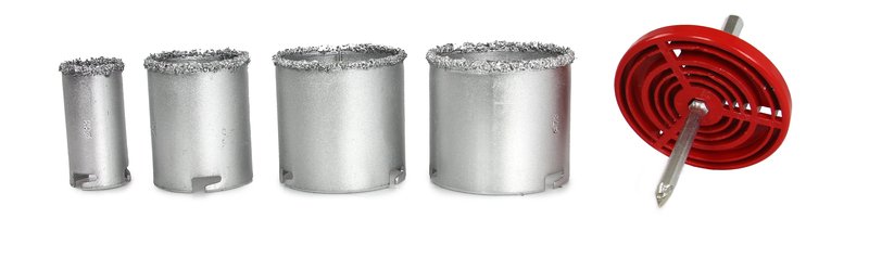 Комплектът включва дръжка и пилотно свредло. Волфрамовото покритие улеснява пробиване в различни видове строителни материали, включително керамични плочки.